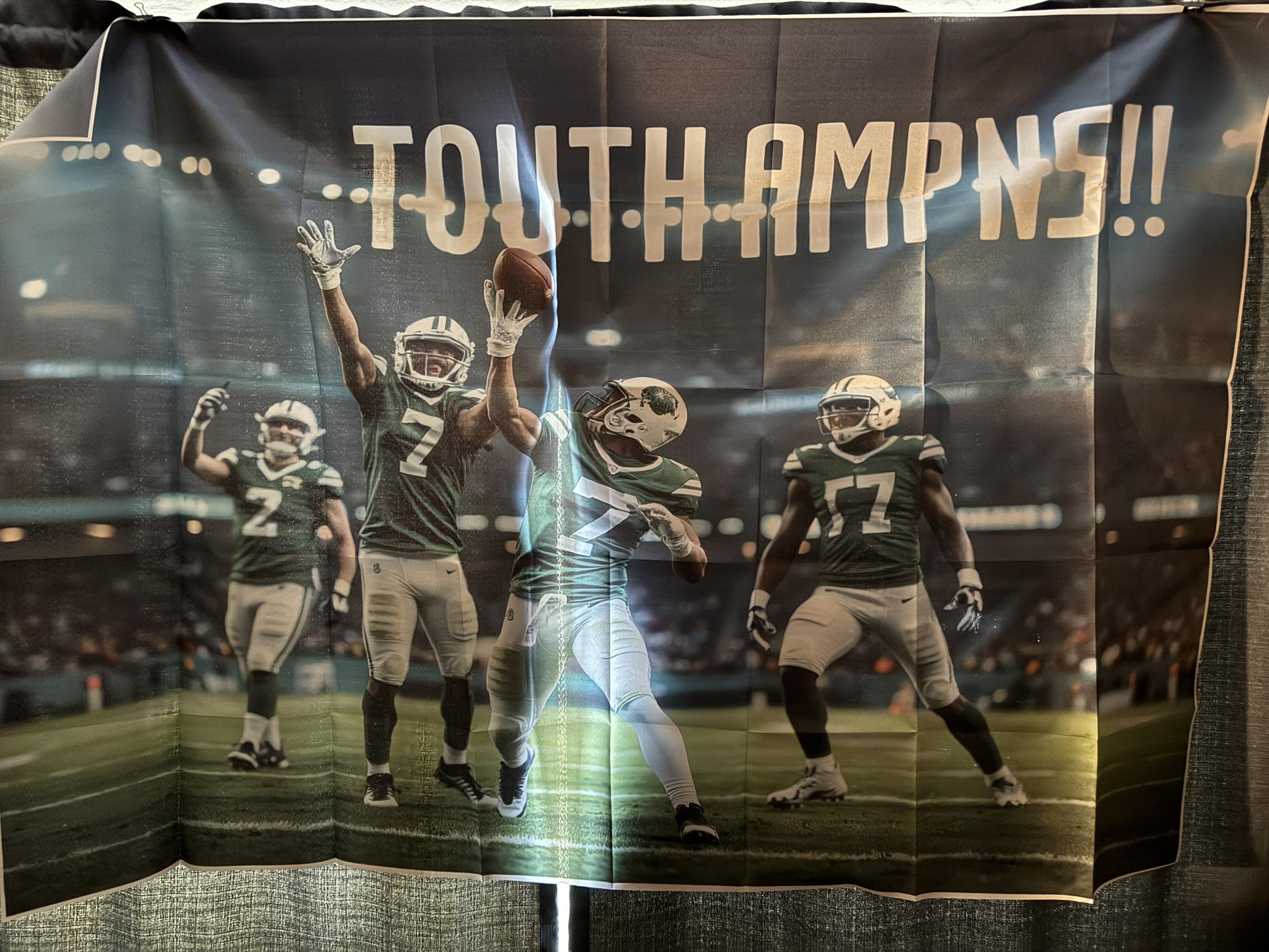 1pc Football-Themed Backdrop with "TOUCHDOWN!!" Text - Green Jersey Players, Stadium
